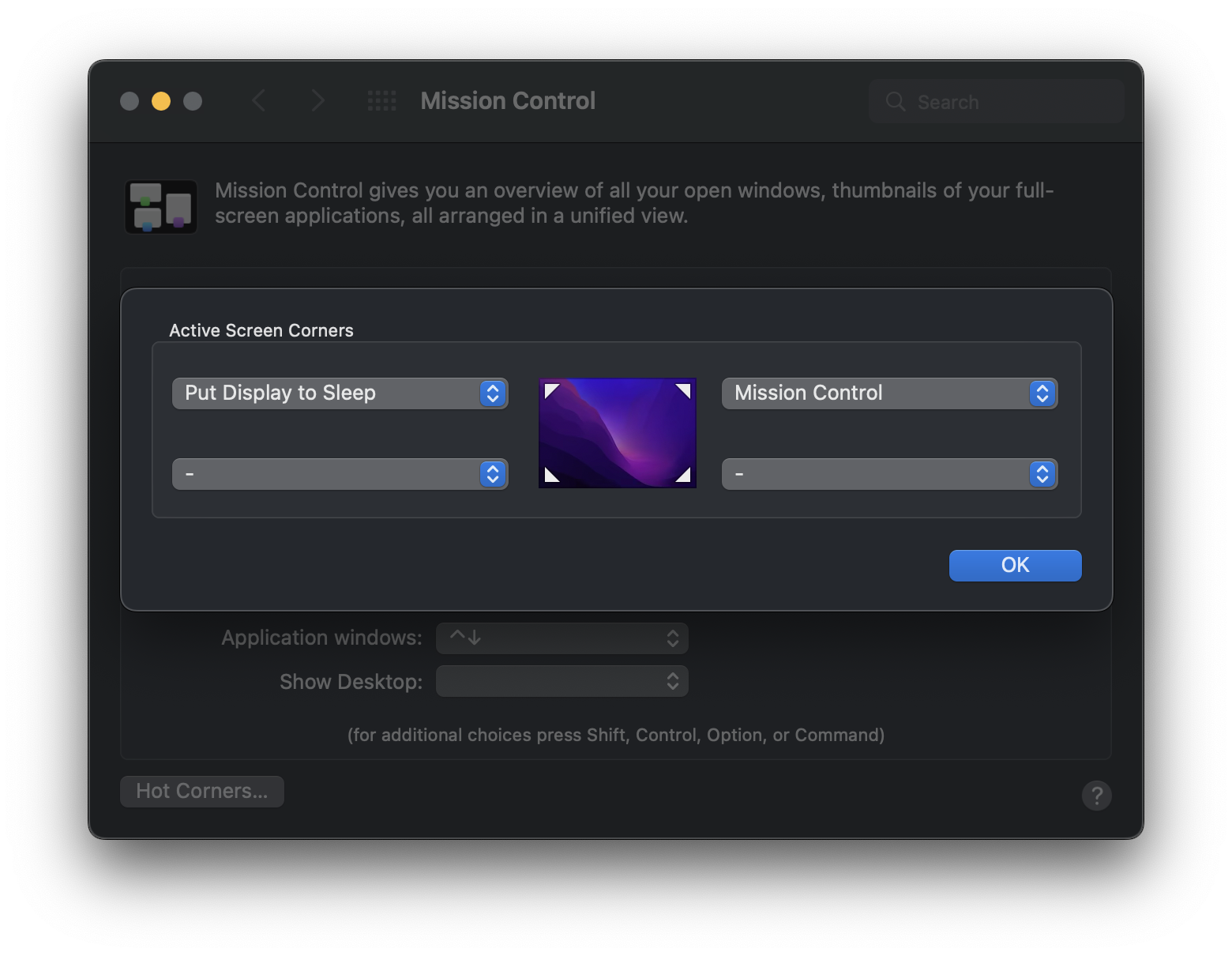 핫코너는 맥을 처음 사용할 때 신기해서 많이 사용하였던 것 같은데 사용할수록 마우스를 끄트머리로 가져가는 속도보다 제스처를 이용하는 게 훨씬 빠르기 때문에 맥을 쓸수록 안 쓰는 기능인 것 같다. 물론 트랙패드 말고 마우스를 사용해야 하는 상황이라면, 편하겠지만, 그마저도 단축키를 만들어두는 편이 빠르다.