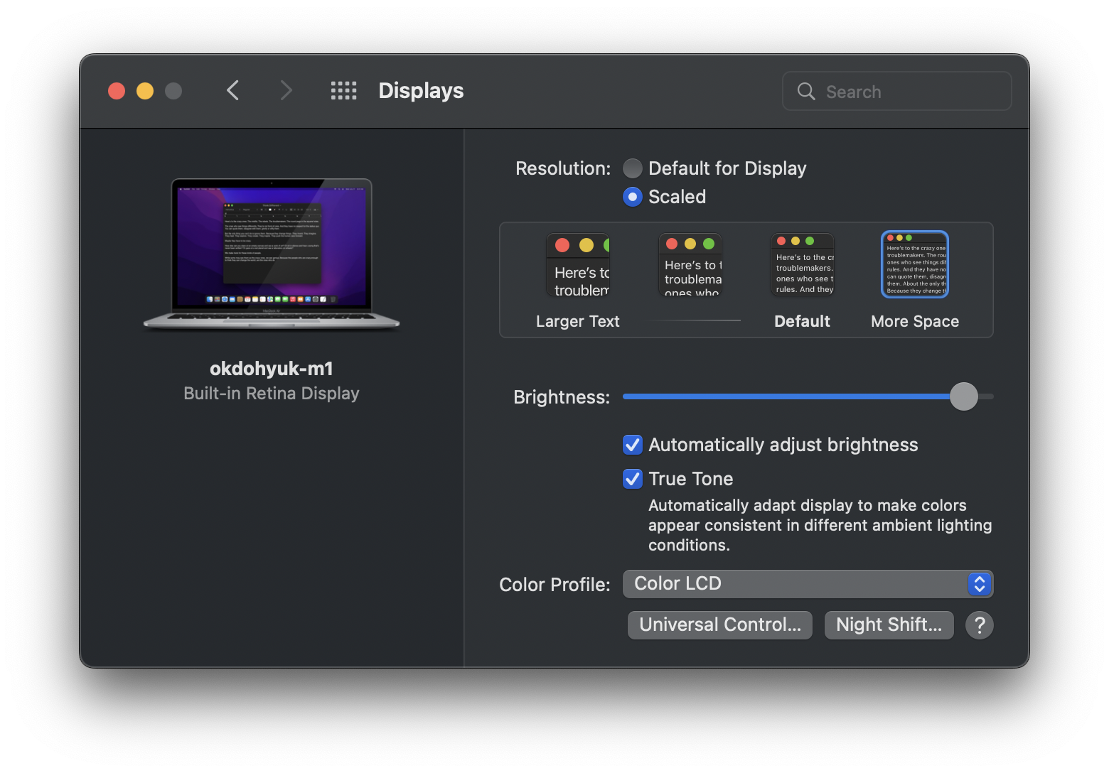 다른 큰 모니터를 연결해서 사용하면, 어느 정도 배율을 높여주는 것이 좋지만, 카페에 나가서 맥북만 사용하면, 눈앞에 모니터가 있기 때문에 최대한 영역을 넓게 사용한다.