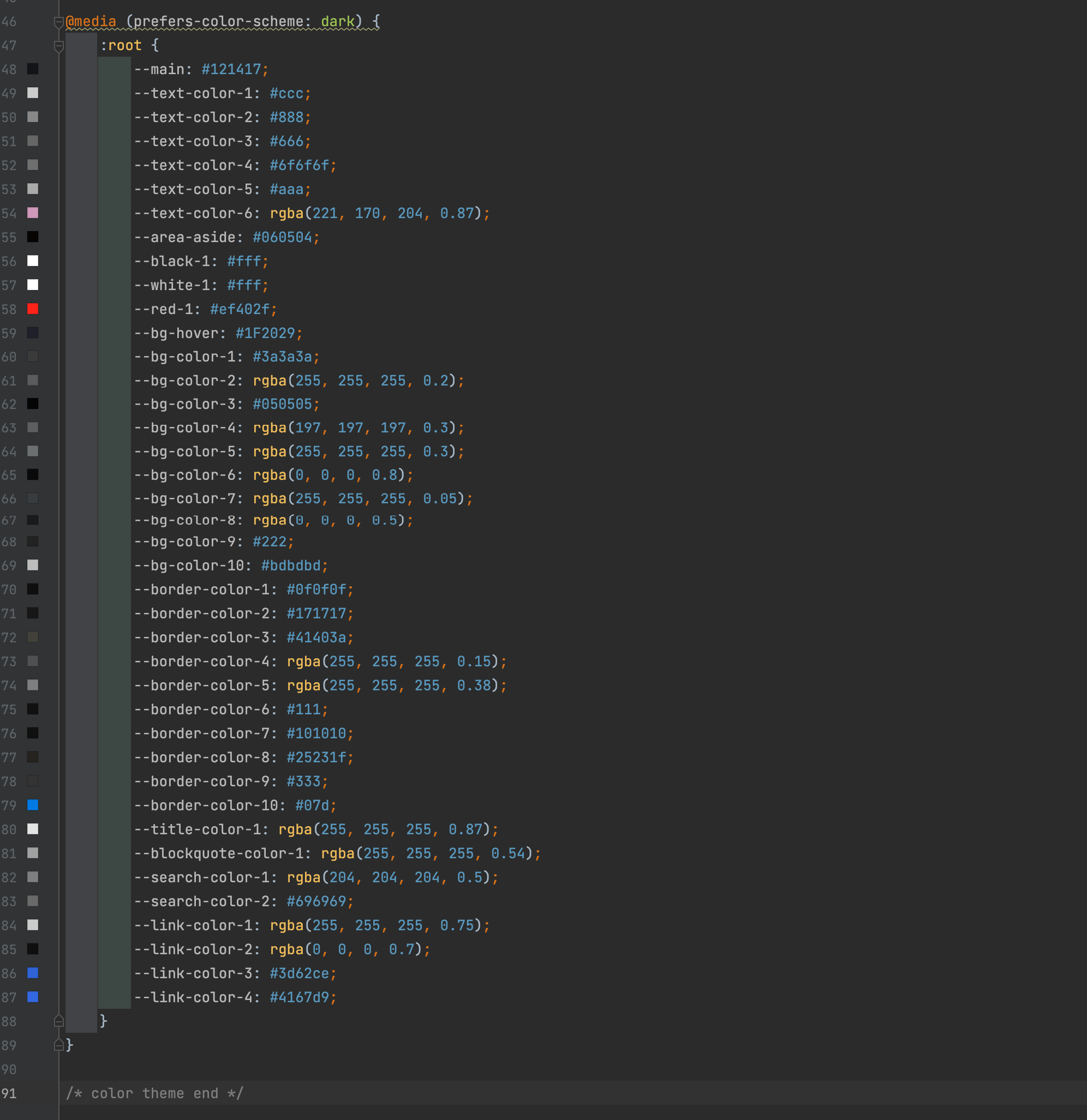 웹스톰에서 rgb로 검색하는 것들을 모두 찾고, #도 검색해서 HEX값인 녀석들을 모두 정리했다. 거의 3시간가량의 중노동으로 마침내 모든 색상값들을 var()로 바꾸었다. 네이밍이 매우 별로이지만, 일단 어느 정도 볼 수준은 되어서 스탑 하였다.