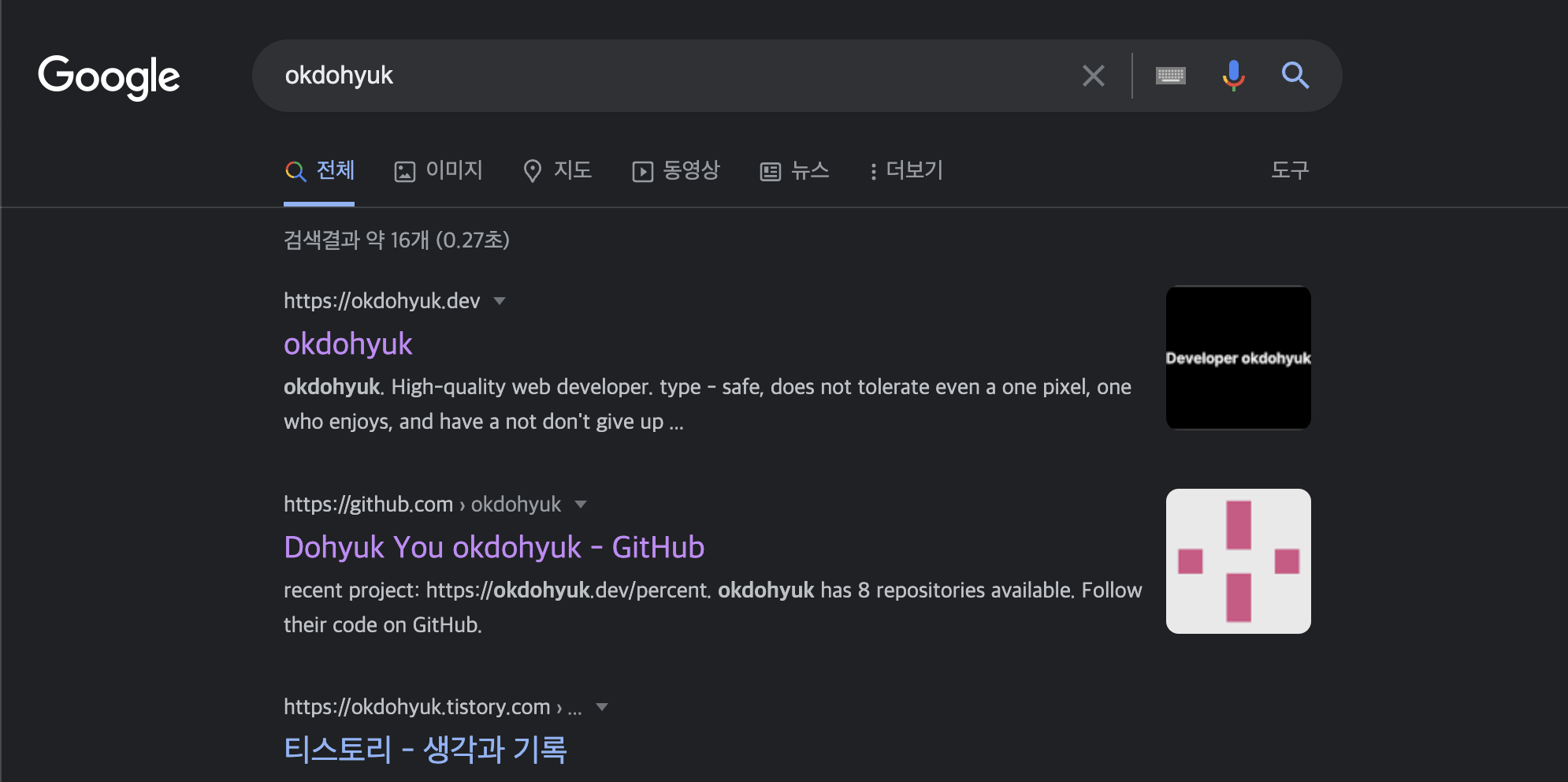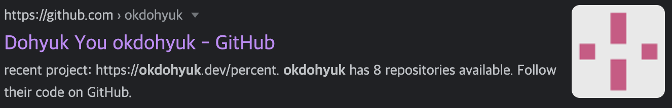 오픈그래프를 설정 후 주기적으로 해당 키워드를 검색해보며 변화하는 검색 결과를 느낄 수 있었다. 그때마다 사진을 찍어두지 않은 것이 아쉽지만, 처음엔 제목으로 설정해둔 developer okdohyuk가 떴지만, 점점 제목이 바뀌고, 썸네일이 추가되고, 깃허브를 넘어스며 1착을 차지하였다.🤣🤣