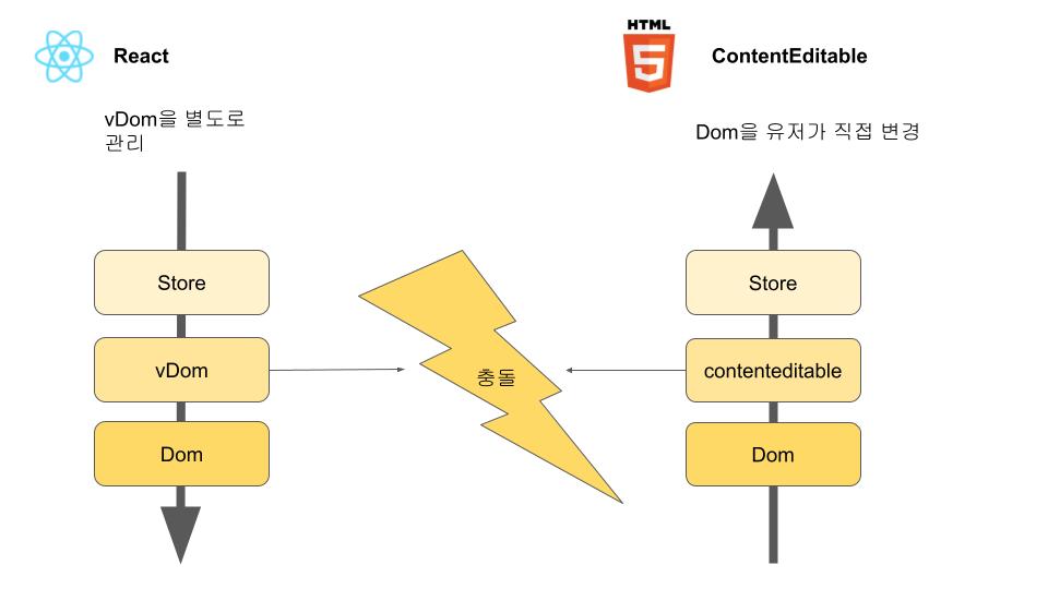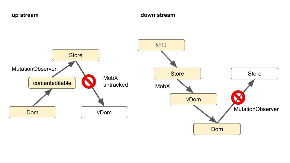 MobX의 untracked API를 이용하여 contenteditable을 이용하는 상황에는 react의 반응을 중단하고 있다가, 백스페이스나 엔터와 같이 데이터 그룹에 영향이 가는 부분은 store를 업데이트하고 vDom을 업데이트할 수 있도록 한다.