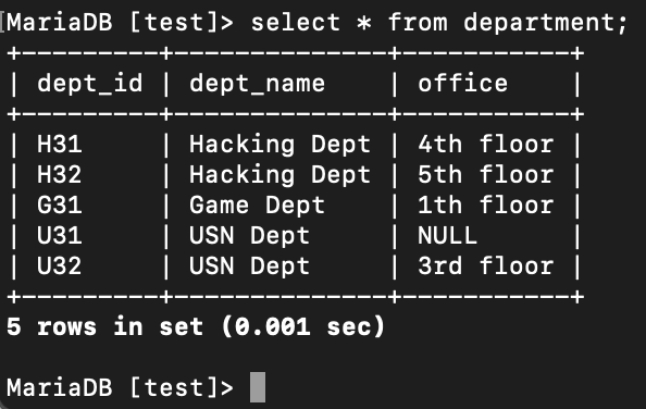 INSERT INTO department VALUES ('H32', 'Hacking Dept', ‘5th floor');