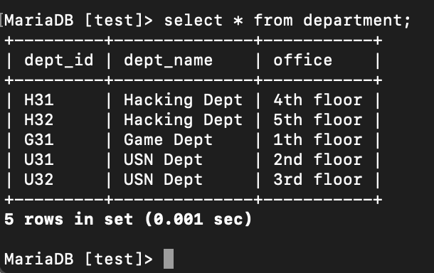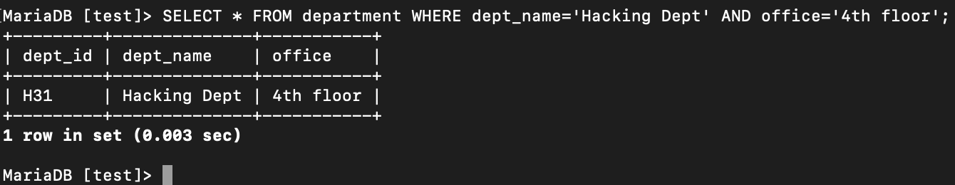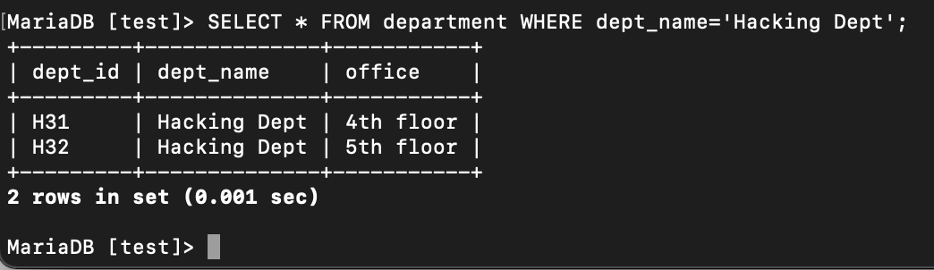 SELECT * FROM department WHERE dept_name=‘Hacking Dept’;