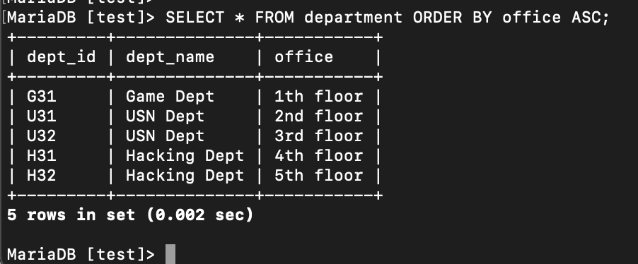 SELECT dept_id '학과아이디', dept_name '학과명', office '위치' FROM department;