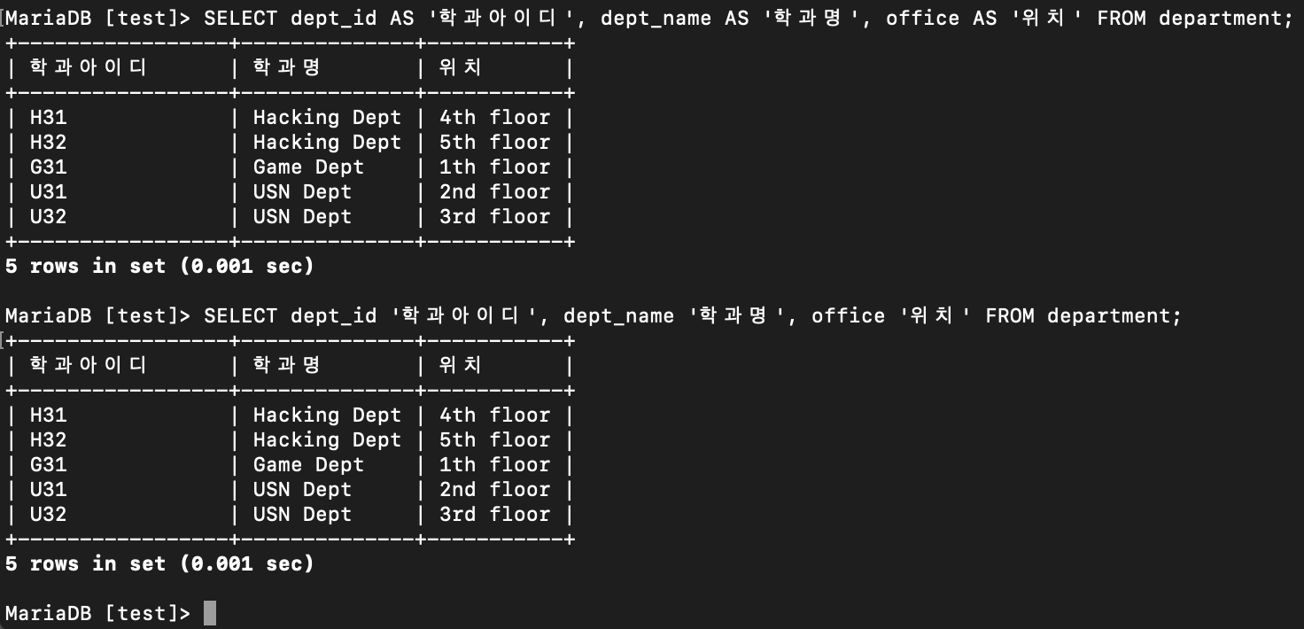 SELECT dept_id AS '학과아이디', dept_name AS '학과명', office AS '위치' FROM department;